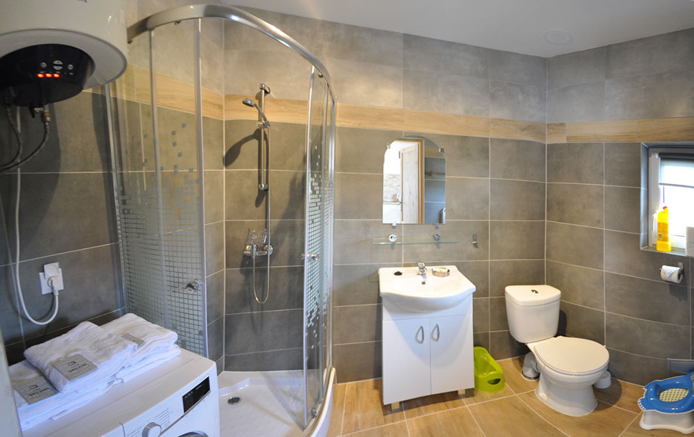 Zwei sehr gut arrangierte und bequeme zwei Etagen Häuser mit einer 60 qm Fläche jedes, als ein Reihenhaus gebaut, . Jedes Haus besitzt eine voll ausgestattete Küche mit Elektroplatte, Kühlschrank, Wasserkocher, Töpfen, Pfannen, Geschirr, Besteck und anderen Sachen, die zur Mahlzeitvorbereitung nötig sind. Jedes Bad wurde in Duschkabine, WC, Waschmaschine mit 1200 Umdrehungen und einen Wäschetrockner ausgestattet.