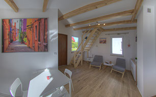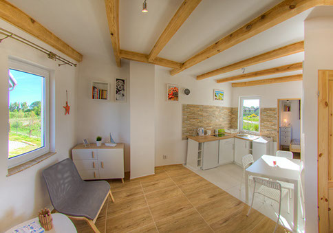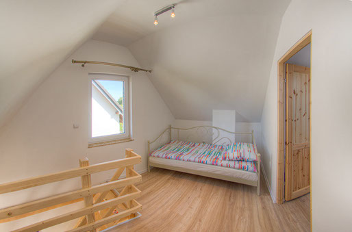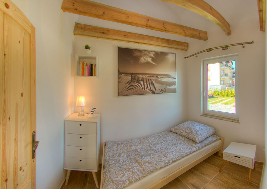 Zwei separate Schlafzimmer wurden in bequeme Betten, Schränke und ein kleines Bücherschrank ausgestattet. Im Schlafzimmer im Erdgeschoss befindet sich ein 90x200 cm Bett, auf der Etage stellen wir Ihnen zur Verfügung drei Betten: ein 140x200 cm und zwei 90x200 cm.