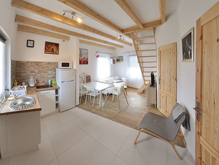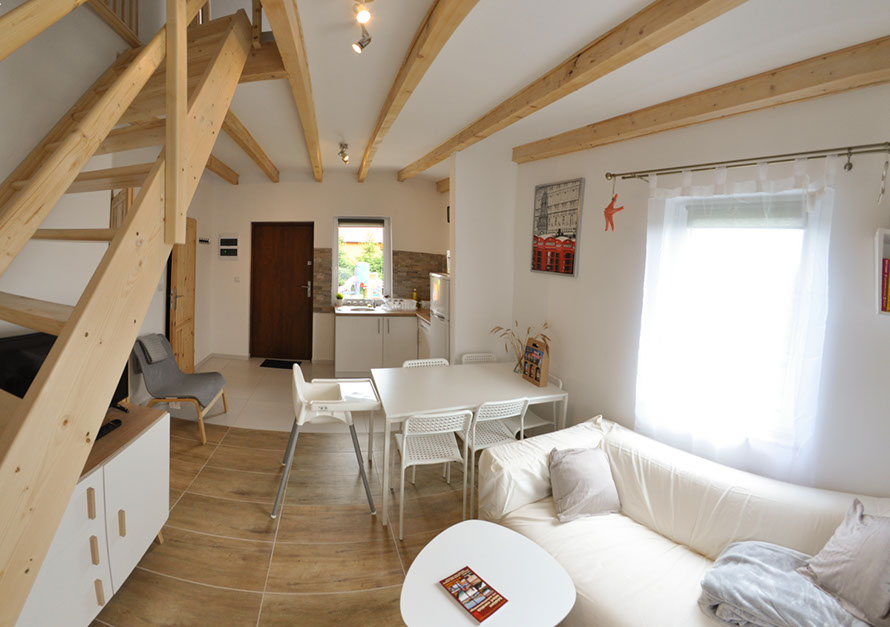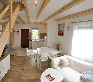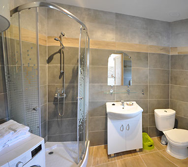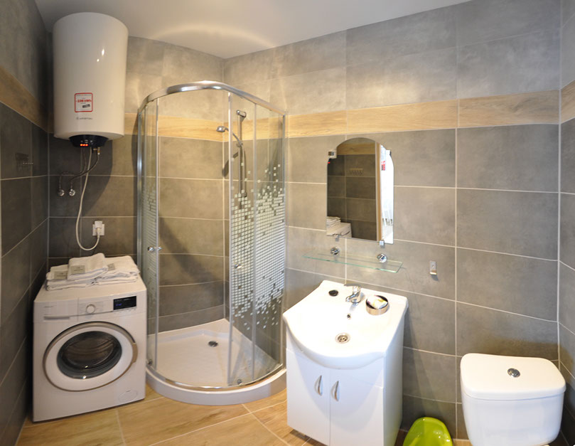 Zwei sehr gut arrangierte und bequeme zwei Etagen Häuser mit einer 60 qm Fläche jedes, als ein Reihenhaus gebaut, . Jedes Haus besitzt eine voll ausgestattete Küche mit Elektroplatte, Kühlschrank, Wasserkocher, Töpfen, Pfannen, Geschirr, Besteck und anderen Sachen, die zur Mahlzeitvorbereitung nötig sind. Jedes Bad wurde in Duschkabine, WC, Waschmaschine mit 1200 Umdrehungen und einen Wäschetrockner ausgestattet.